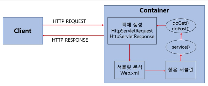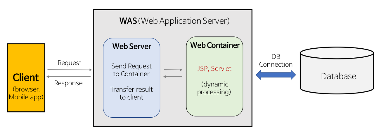 즉, Java는 따로 CGI 와 같은 기능을 위해 컨테이너 라는 것이 필요하고, 이를 WAS 의 웹 컨테이너가 수행합니다.
