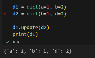 2가지 방법이 있는데 하나는 update 함수를 이용하는 것이고 다른 하나는 dict함수를 이용하는 방법이다.