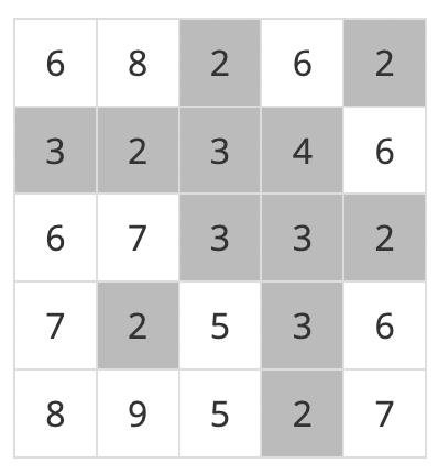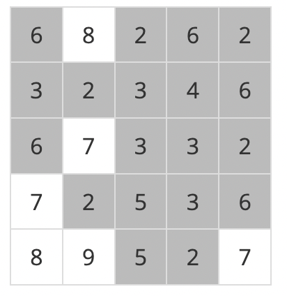 이제 위와 같은 지역에 많은 비가 내려서 높이가 4 이하인 모든 지점이 물에 잠겼다고 하자. 이 경우에 물에 잠기는 지점을 회색으로 표시하면 다음과 같다.