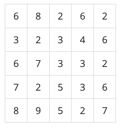 어떤 지역의 높이 정보는 행과 열의 크기가 각각 N인 2차원 배열 형태로 주어지며 배열의 각 원소는 해당 지점의 높이를 표시하는 자연수이다. 예를 들어, 다음은 N=5인 지역의 높이 정보이다.