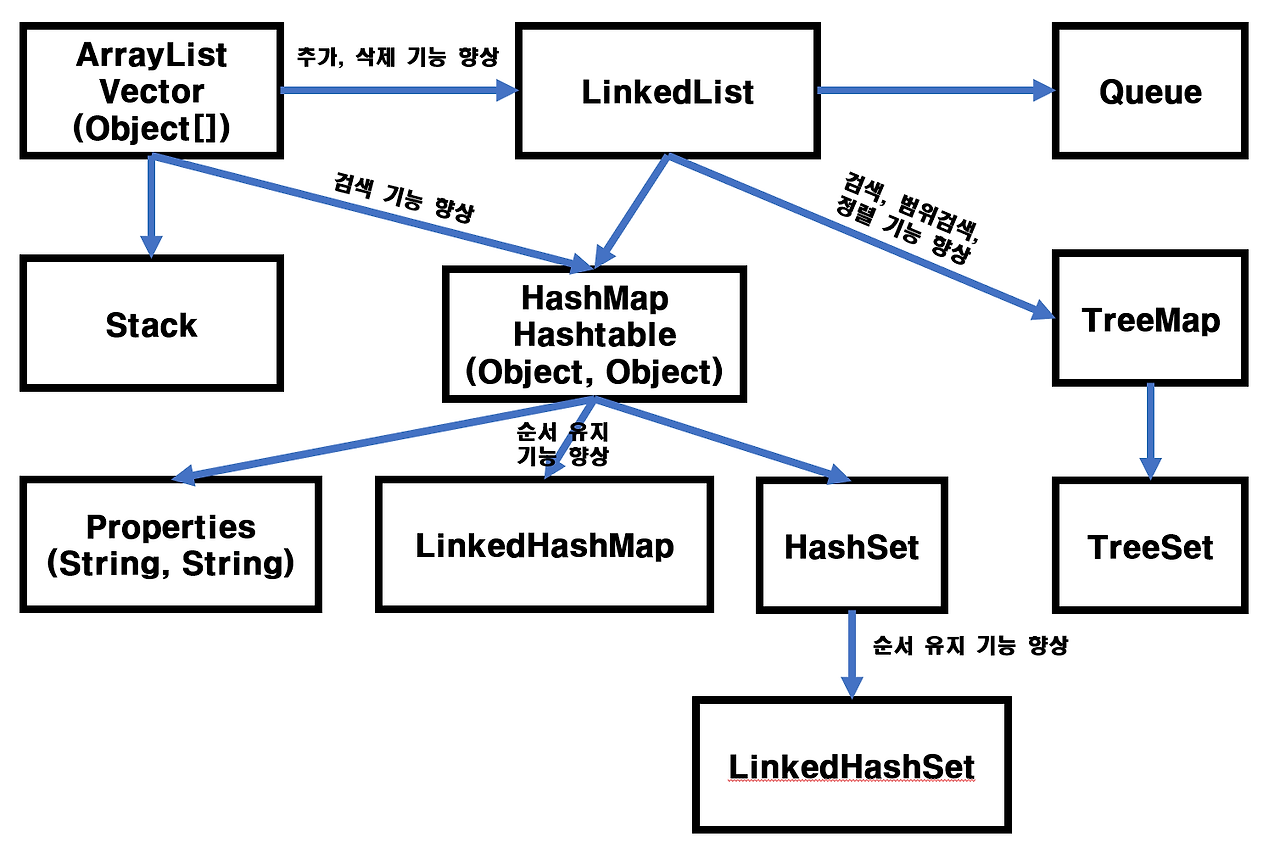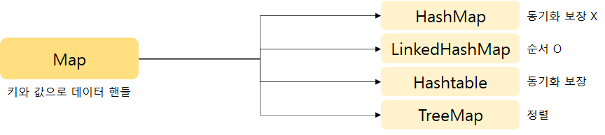 Map | 키-값 구조, 키 중복 불가 | HashMap |