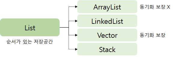 index 로 요소에 접근List 와 배열의 차이List 는 자료형 크기가 고정 아닌, 데이터 양에 따라 동적으로 늘아났다 줄어들 수 있음List 인터페이스를 구현한 대표적인 구현체ArrayList, LinkedList
