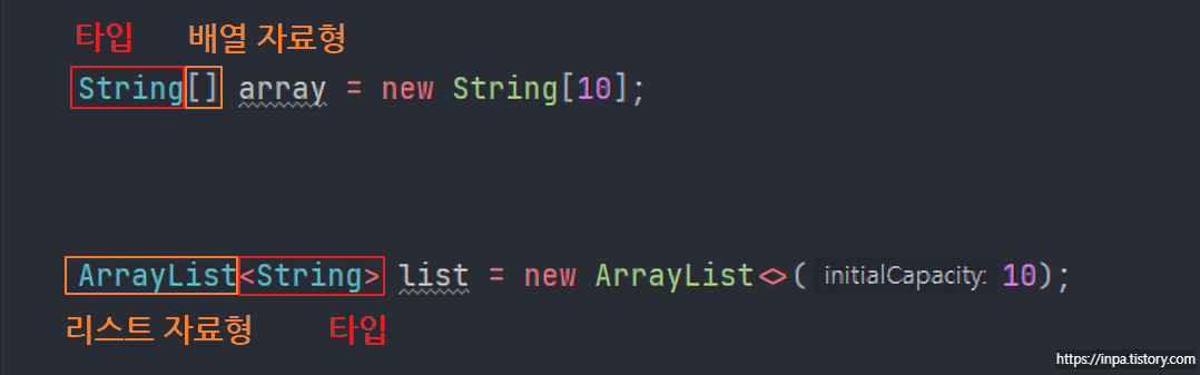 위의 식과 차이점은 배열에 저장할 Sample 객체의 타입 파라미터를 Integer 로 지정한다는 뜻이다.