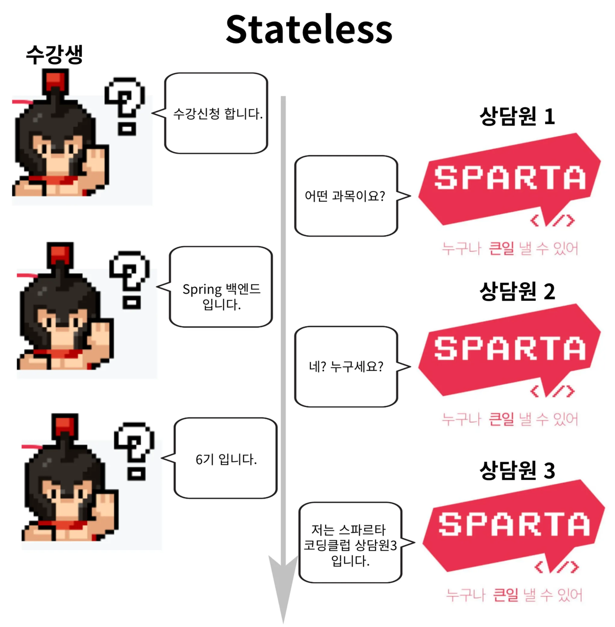 - 상담원(서버)은 수강생(클라이언트)의 요청들을 기억(상태 유지)해 다음 질문들에 대한 처리 가능