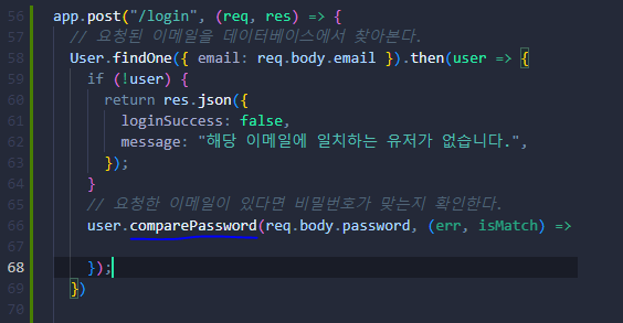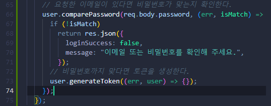 위에서 만든 메서드가 err과 isMatch를 return해주면, isMatch가 false일때(비밀번호가 일치하지 않을 때) loginSuccess는 false가 된다.