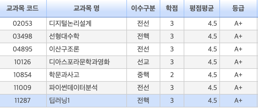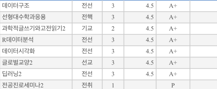 그래도 결과만 좋으면 된다고 생각한다. 1학기 성적은 올 A+로 만족스럽게 끝냈다.