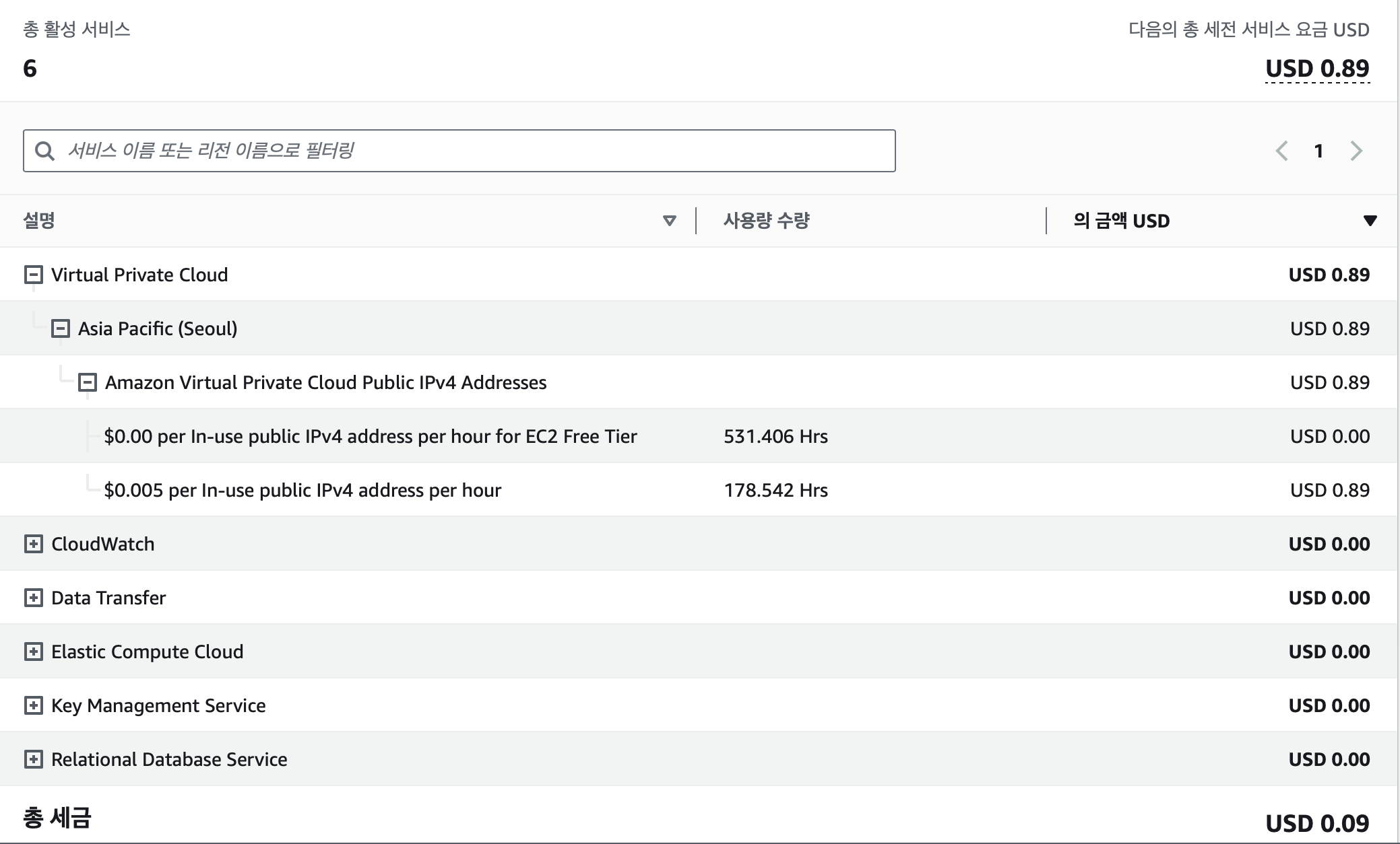 AWS 콘솔 > 결제 및 비용관리 > 청구서에 들어가면 아래처럼 청구 항목을 확인할 수 있다.