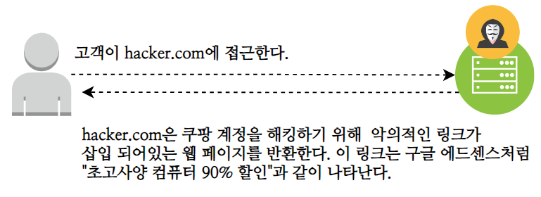 이때 hacker.com은 상민이의 쿠팡 계정을 해킹하기 위해 링크가 삽입 되어있는 웹 페이지를 반환한다.