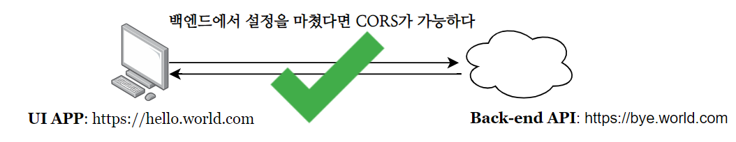 그림을 보자. hello.world.com 출처에서 by.world.com이란 다른 출처의 api를 호출했다. 이때 CORS를 허용하지 않으면 api를 통해 리소스에 접근할 수 없다.