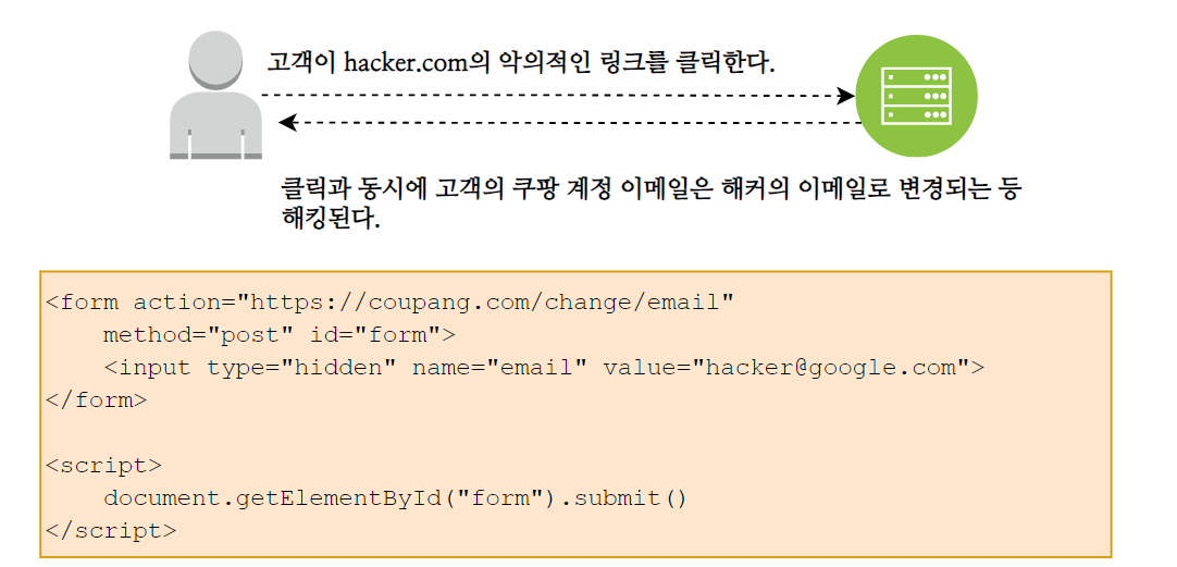 쿠팡의 BE 서버는 로그인 쿠키가 이미 동일한 브라우저에서 존재하고 있고, 해커의 계정 정보 변경과 같은 악의적인 요청이 동일한 coupang.com이란 도메인에서 이루어지고 있기 때문에, 상민이의 요청인지 해커의 요청인지 구별할 수 없다.