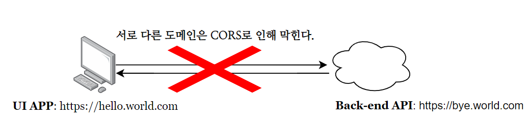예를 들어 UI 앱에서 서로 다른 도메인인 API를 호출할 시 CORS로 인해 기본적으로 차단된다. 이는 대부분의 브라우저에서 구현되는 W3C의 스펙이다.