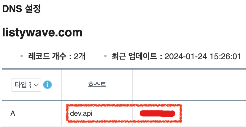 아래처럼 A 레코드에 호스트 이름을 dev.api로 지정하고 뒤에 EC2 ip 주소를 입력했다.