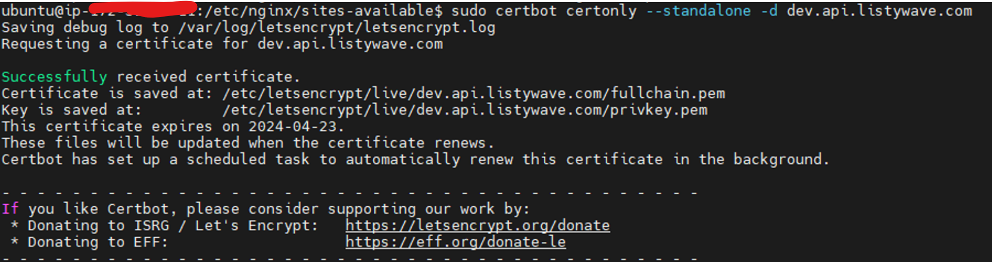 sudo certbot certonly --standalone -d dev.api.listywave.com