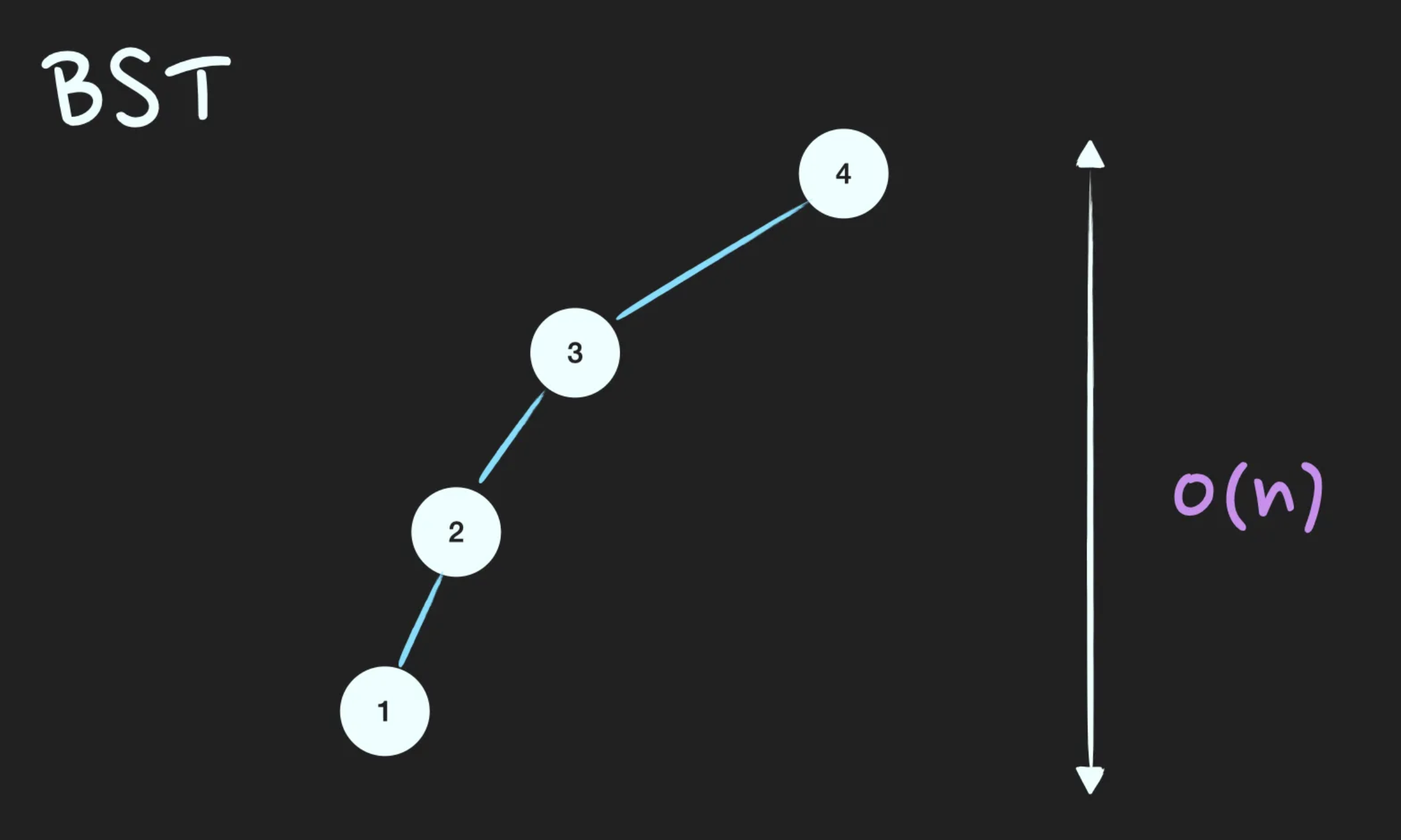 균형이 많이 깨져서 한 쪽으로 치우친 BST의 경우에 worst case가 됩니다. 이렇게 되면 Linked list와 다를게 없어집니다. 따라서 탐색시에 이 아니라 이 됩니다.