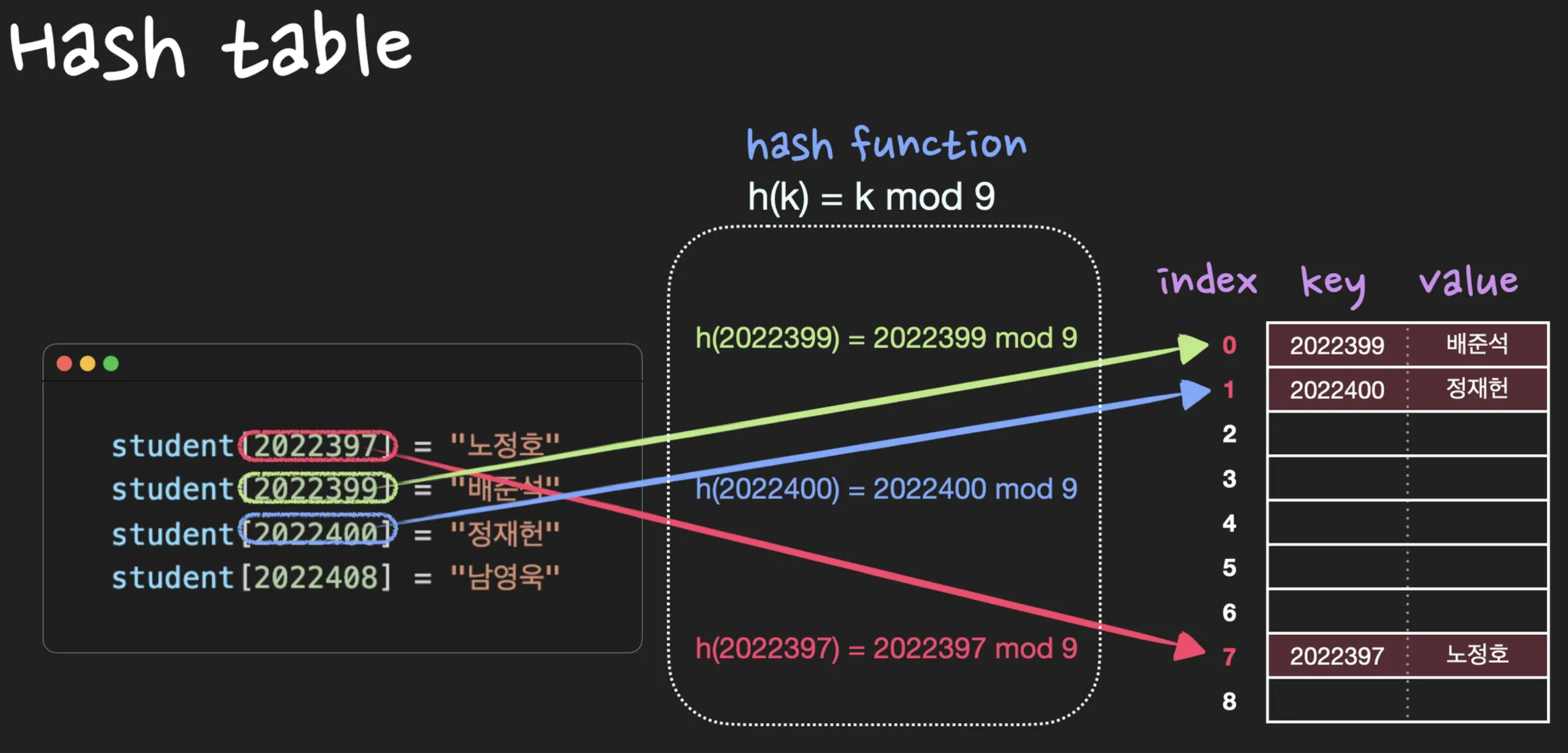 (key, value) 데이터 쌍을 저장하기 위한 방법으로 직접 주소화 방법이 잘 맞지않습니다. hash table은 hash function 를 이용해서 (, )를 index: 에 저장합니다. 이 때, “키 값을 갖는 원소가 위치 에 hash된다.” 또는 “는 키 의 해시값이다”라고 표현합니다. key는 무조건 존재해야 하며, 중복되는 key가 있어서는 안됩니다.