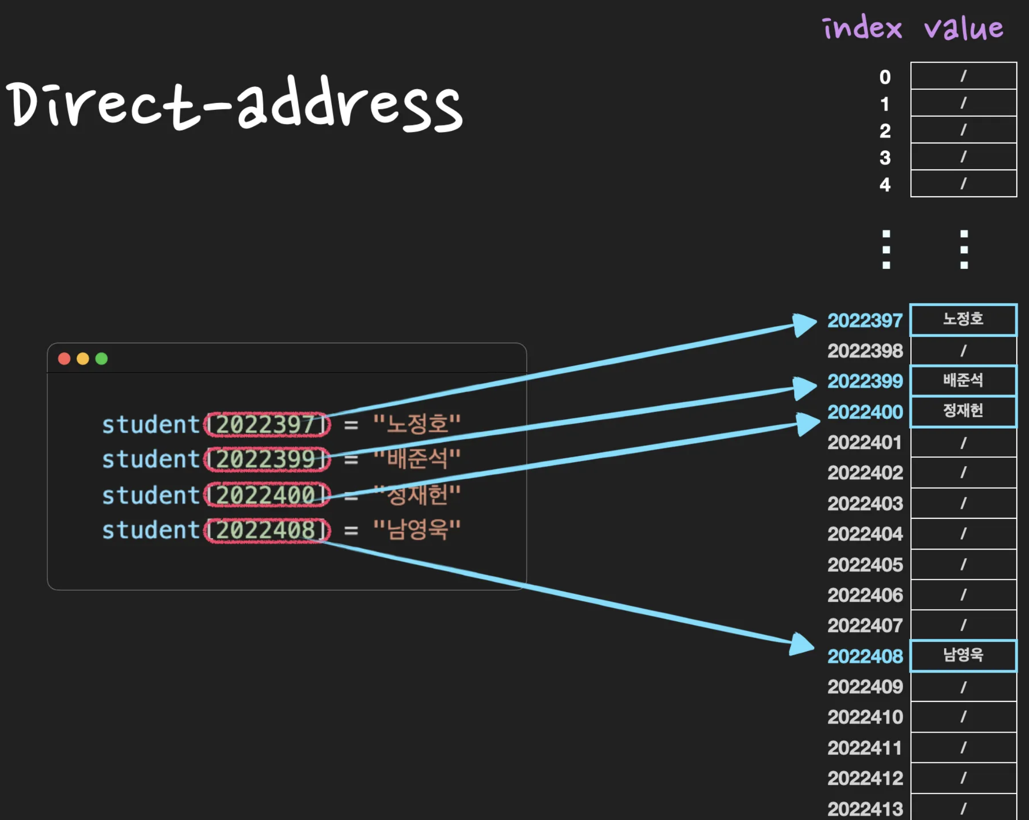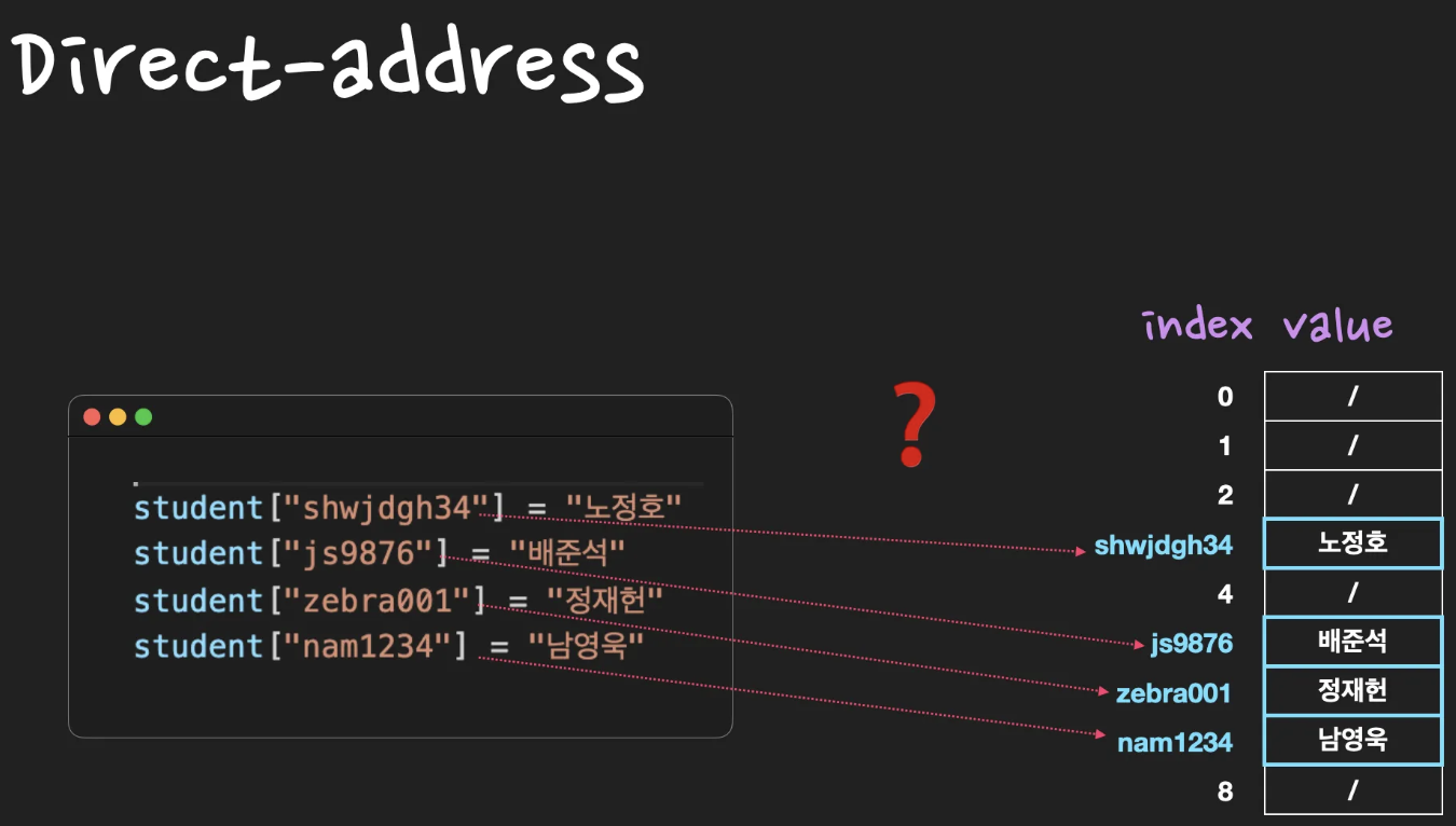 Direct-address Table(직접 주소화 테이블)이란, key 값으로 k를 갖는 원소는 index k에 저장하는 방식입니다.