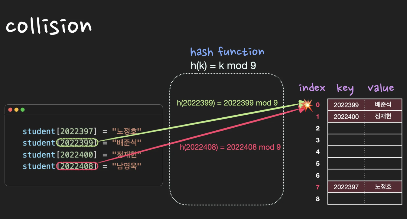 collision이란 서로 다른 key의 해시값이 똑같을 때를 말합니다. 즉, 중복되는 key는 없지만 해시값은 중복될 수 있는데 이 때 collision이 발생했다고 합니다. 따라서 collision이 최대한 적게 나도록 hash function을 잘 설계해야하고, 어쩔 수 없이 collision이 발생하는 경우 seperate chaining 또는 open addressing등의 방법을 사용하여 해결합니다.