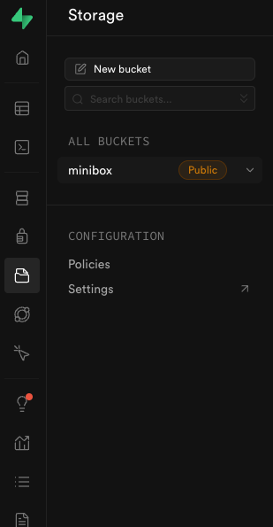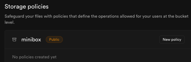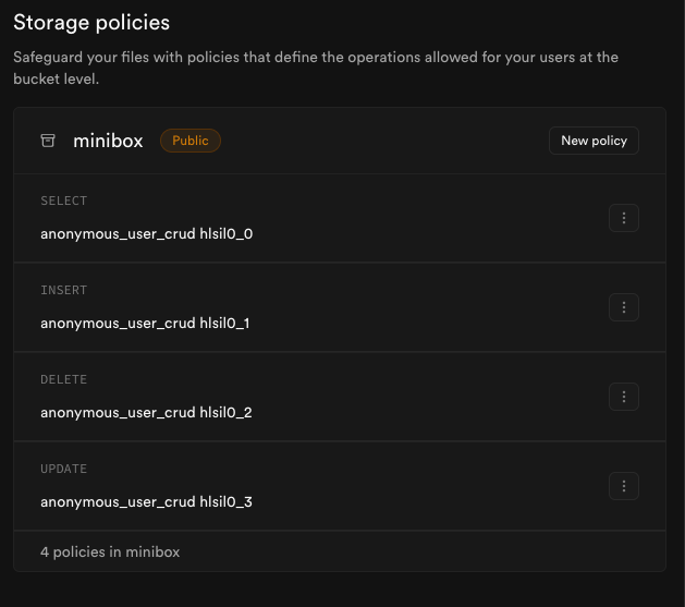 스토리지 생성 되면 Policies 만들어야됌 좌측 하단 메뉴바 보면 있음 . 클릭 ㄱㄱ