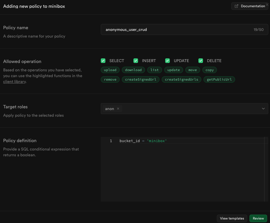 그럼 또 policy 이름 만들고 (SELECT, INSERT, UPDATE, DELETE)기능 설정 , 누가 또 접근 할 수 있는지, 아래처럼 해주고 review 클릭 하셈 그러고 save policy 까지