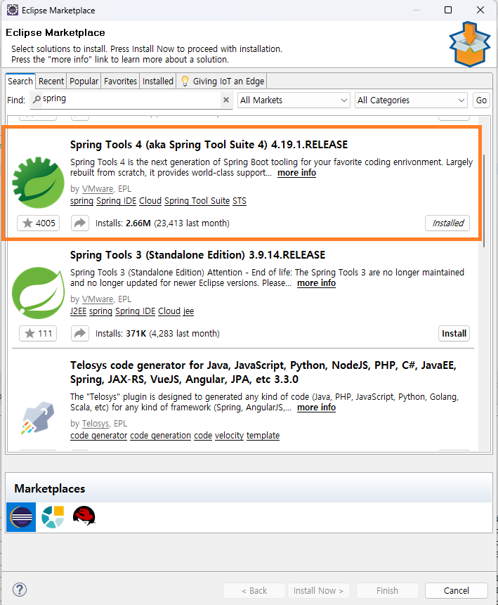 간단하게 이클립스 마켓플레이스에서 sts 4를 설치해준다.