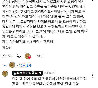 좋아하는 사람들을 자주 보는 것 또한 좋아한다. 저 유투브 채널을 볼 때는 행복하다. 이 행복도 보면 사소한 것에서 비로소 되는 것 같다. 댓글도 보면 나처럼 고민하는 사람들도 꽤 있는 것 같다.