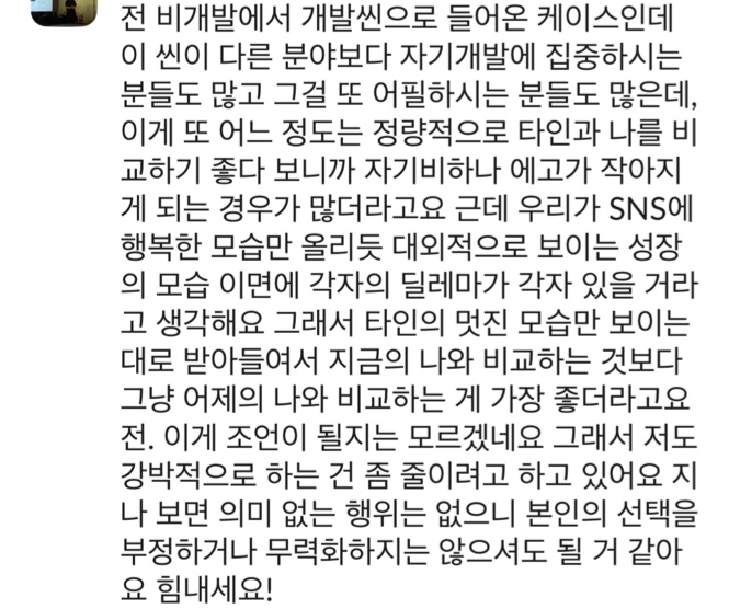 sns등 너무 잘나가는 사람들도 많고 특히 개발오픈된 세상이 장점이자 단점이 되는 것 같다. 장점은 나한테 정보를 주고자 하는 사람들이 많다. 좋은 사람들도 많다. 하지만 그만큼 단점은 비교가 된다는 것이다.