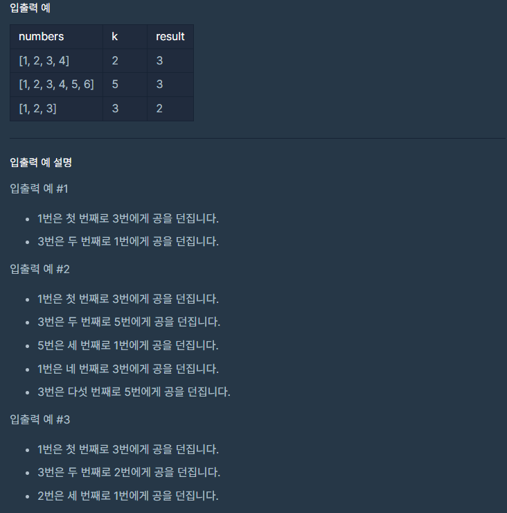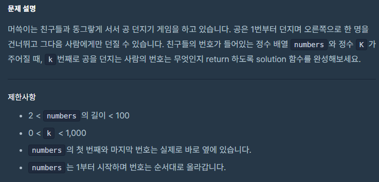 으로 초기화 후에 반복을 수행했다.def solution(numbers, k):