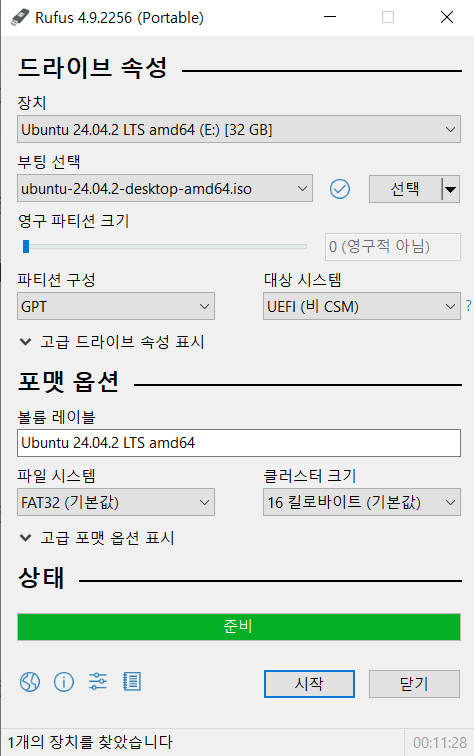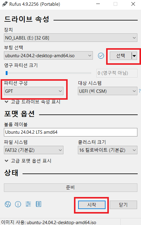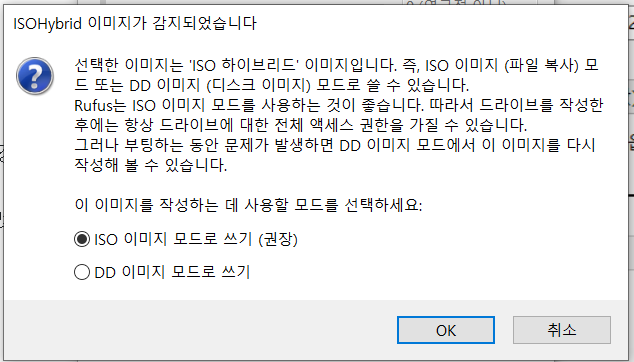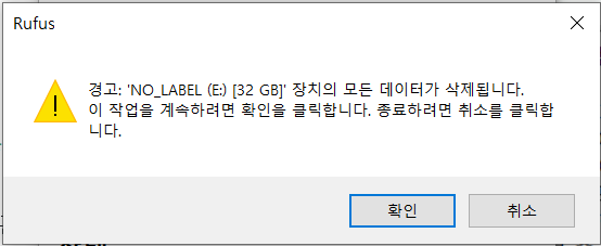 파티션 방식을 잘못 선택하면 USB 저장 장치로 부팅할 수 없으며, 다시 루퍼스로 우분투 설치 매체를 생성해야 한다.