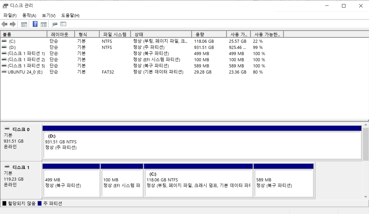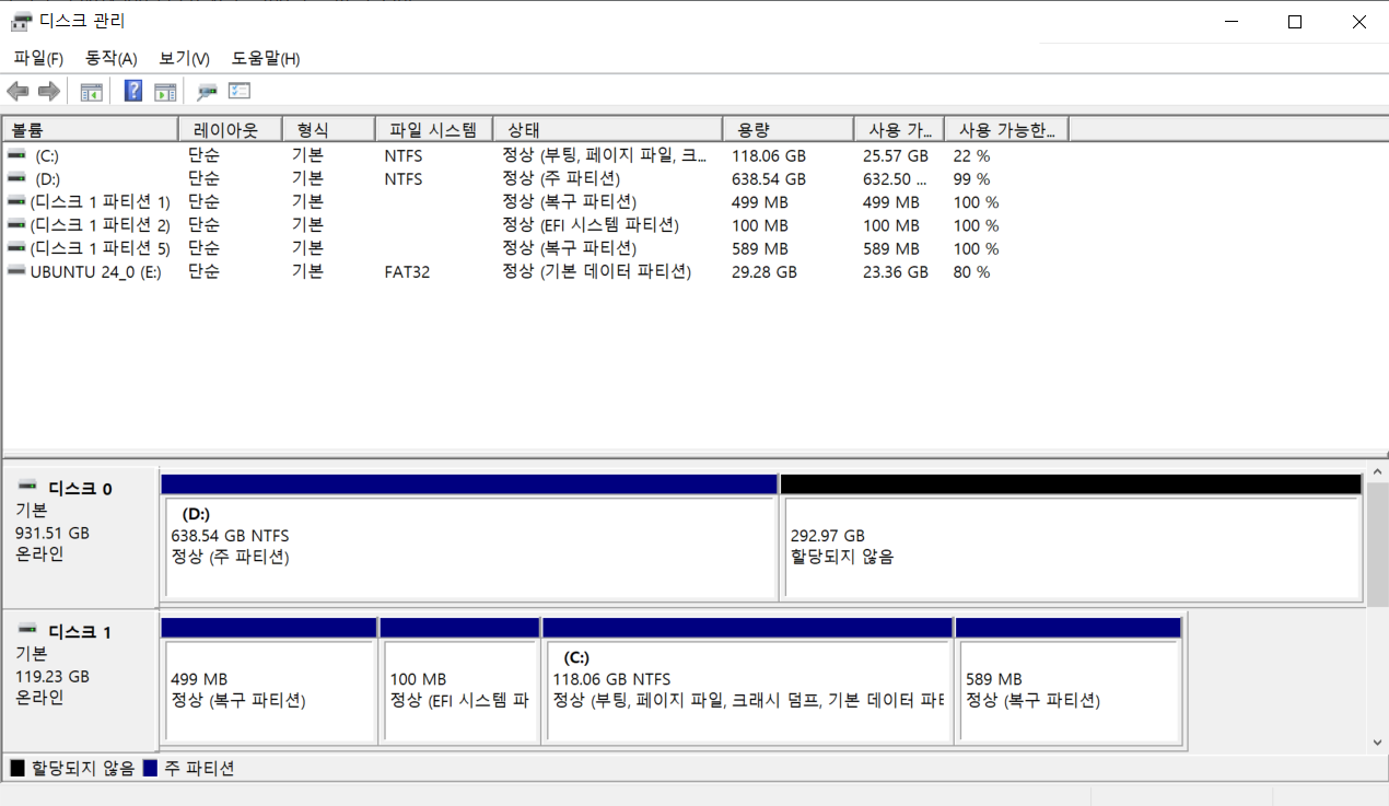 윈도우 디스크 관리 도구로 새로운 파티션을 생성하여 우분투 OS가 설치될 공간을 마련해보자.