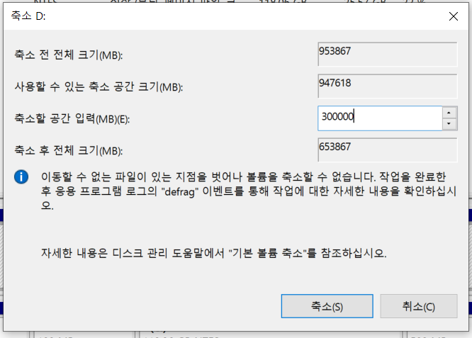 줄이려는 볼륨(보통 C: 또는 주 파티션으로 가장 용량이 많은 파티션)을 마우스 우클릭 한 뒤, 볼륨 축소를 클릭한다.