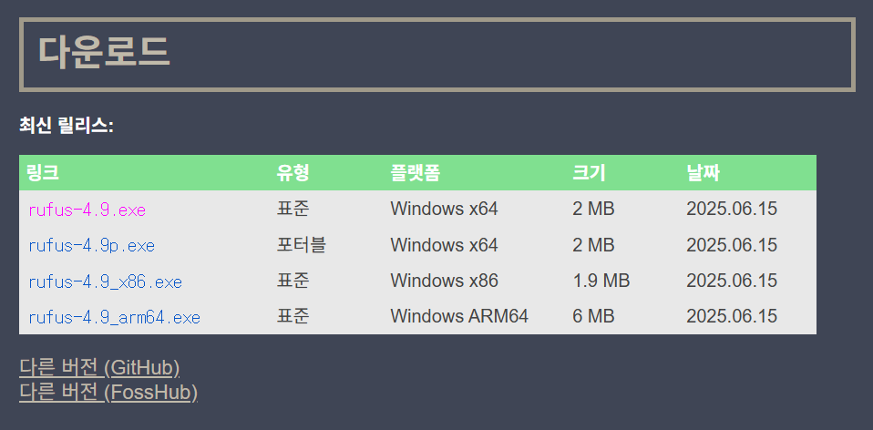 https://rufus.ie/ko/ 에서 사양에 맞는 파일을 선택하여 내려받는다.
