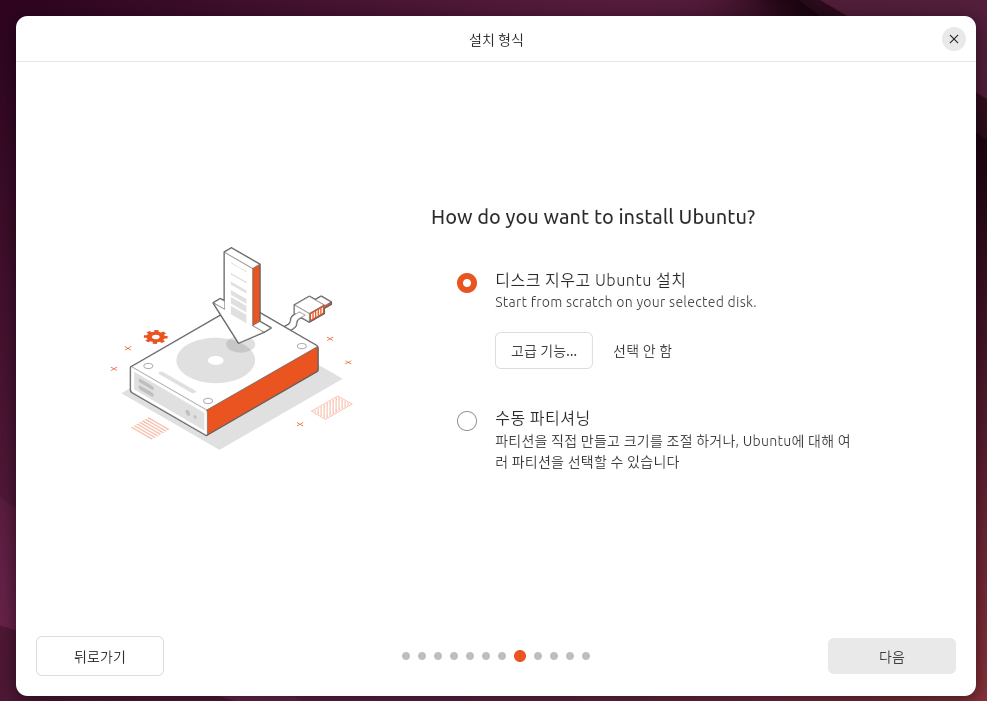 디스크 지우고 우분투 설치를 선택한다. 듀얼부팅과 달리 가상환경이므로 이 방법을 선택해도 안전하다.