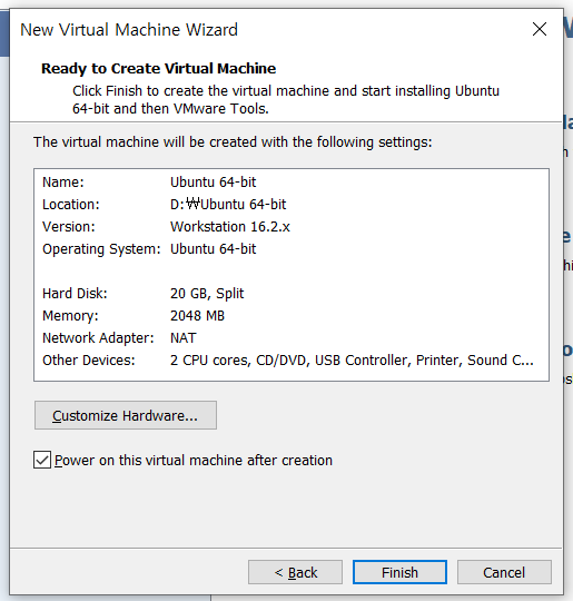설정된 정보가 맞는지 확인 후 Finish를 클릭하면 가상머신 환경이 구축된다.