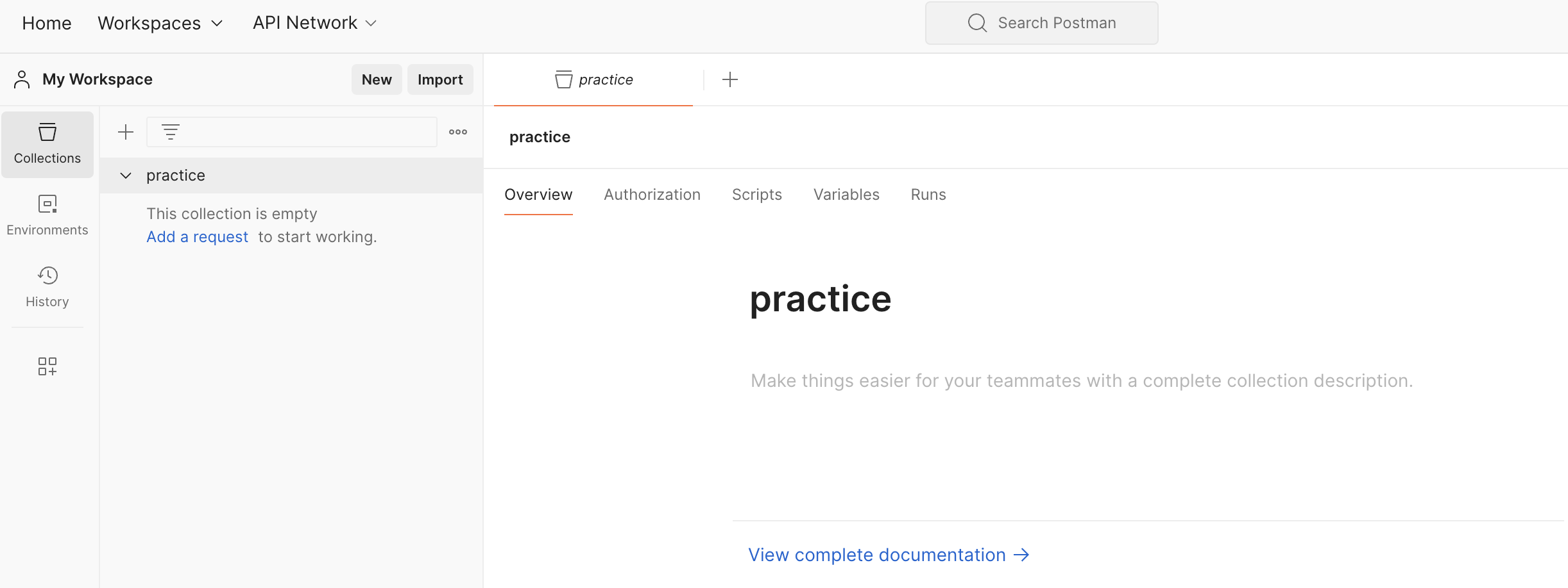 My Workspace에 들어가서 연습할 Collection을 만든다.