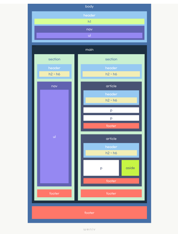 - aritcle과 section 요소는 heading 요소와 함께 사용하는 것을 권장(높이 없이 비워두기도 함)
