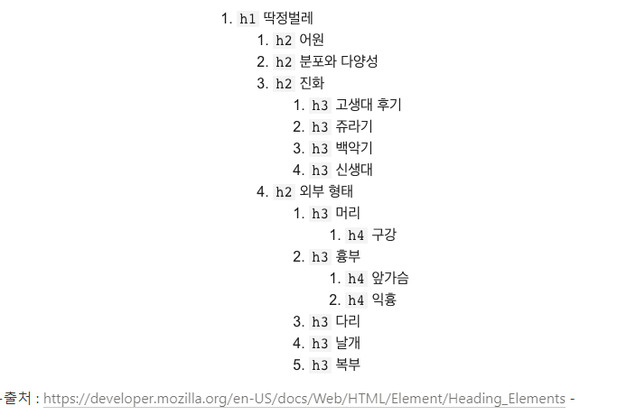 heading 요소를 사용하면 익명 영역을 생성한다. living standard에 section에 해당 태그가 들어가 있으나, 이해를 돕기 위해 글자 태그로 그룹핑 했다.<h1>hello world</h1> <h2>hello world</h2> <h3>hello world</h3> <h4>hello world</h4> <h5>hello world</h5> <h6>hello world</h6>또한 heading 요소들은 아래와 같이 사용자로 하여금 페이지의 계층구조를 쉽게 파악할 수 있도록 한다. 그렇기 때문에 특별한 이유 없이 heading 레벨을 갑자기 몇 단계 뛰어넘도록 작성하는 것은 지양해야 한다.