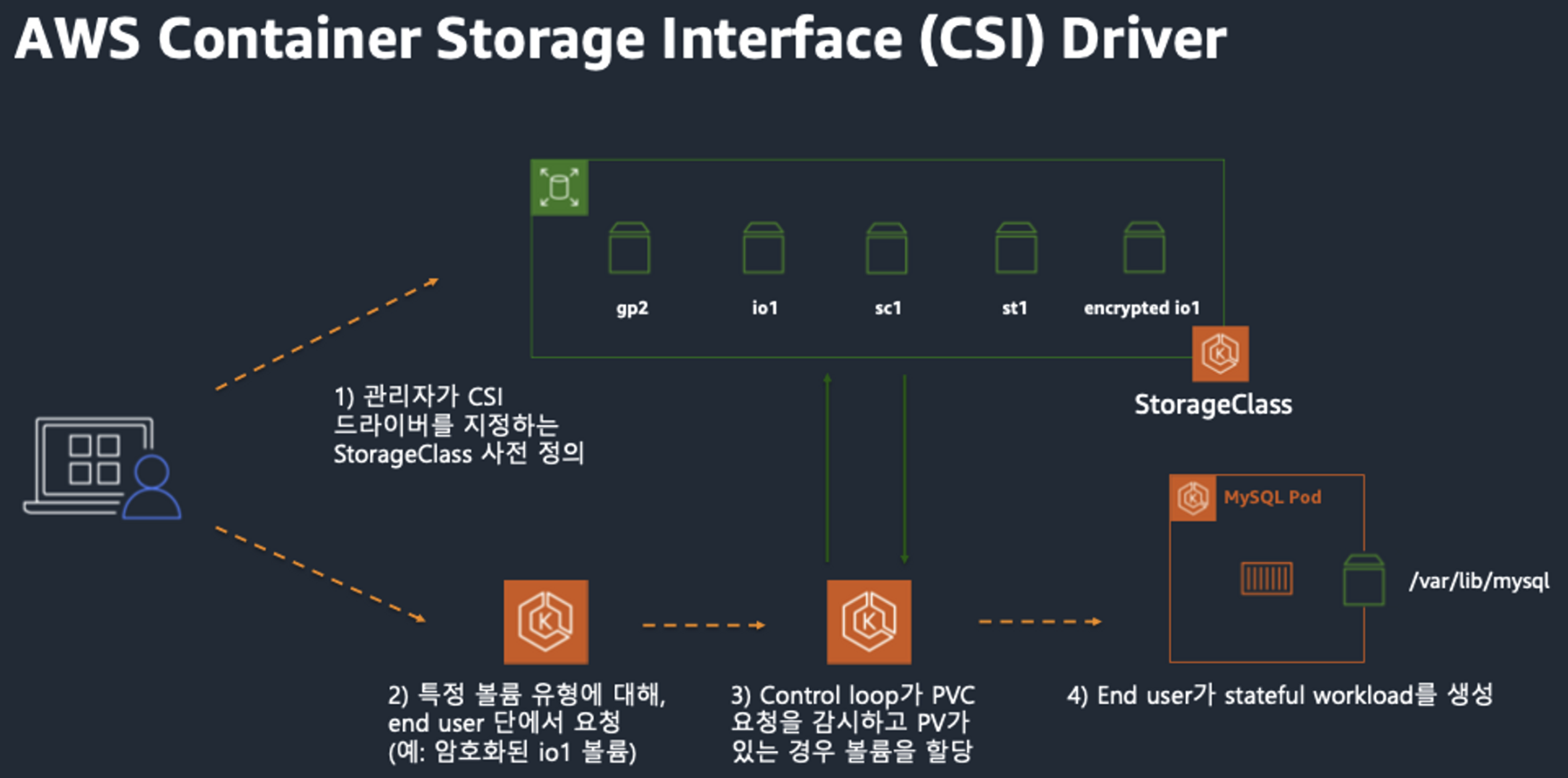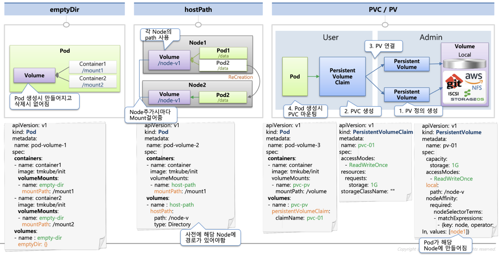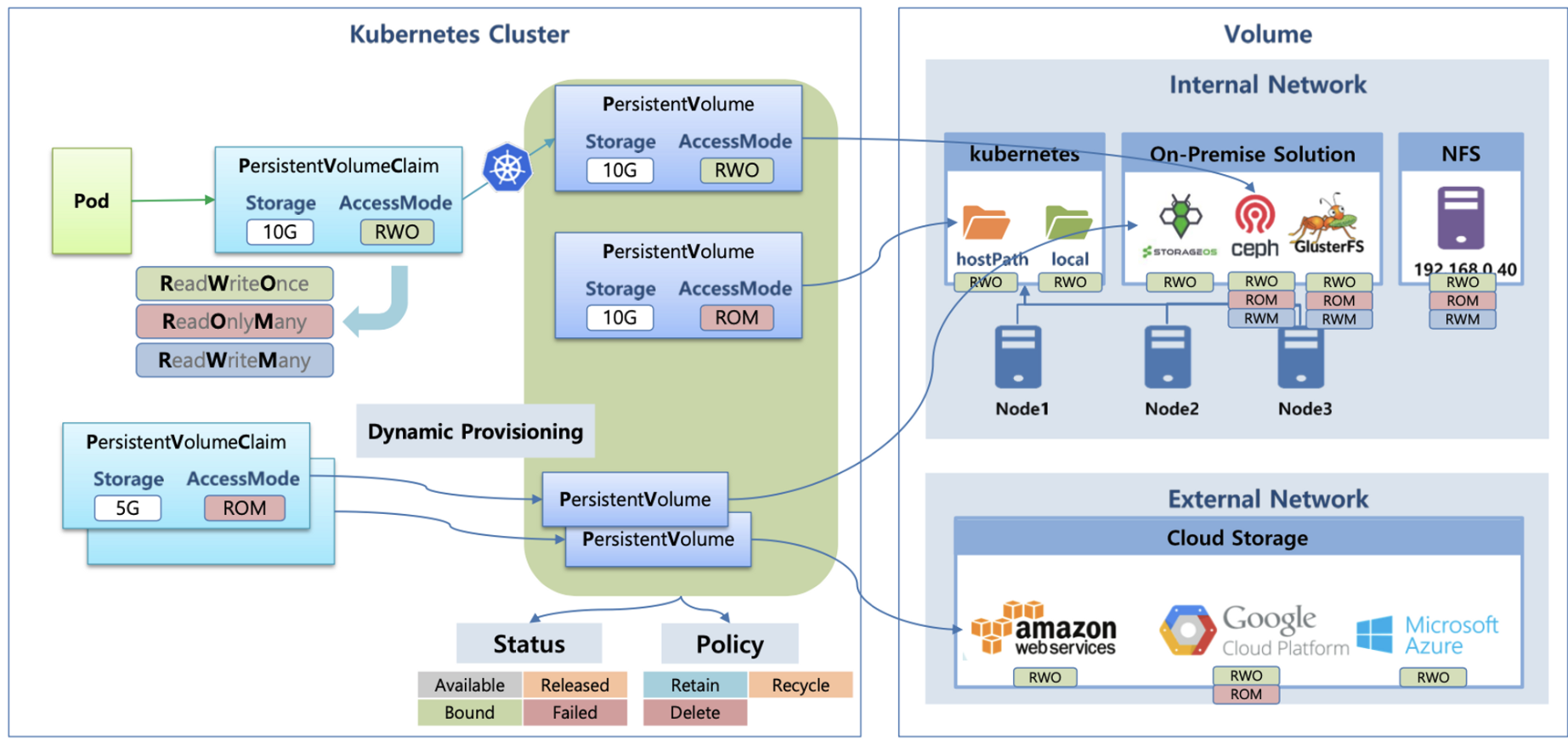 다양한 볼륨 사용 : K8S 자체 제공(hostPath, local), 온프렘 솔루션(ceph 등), NFS, 클라우드 스토리지(AWS EBS 등)