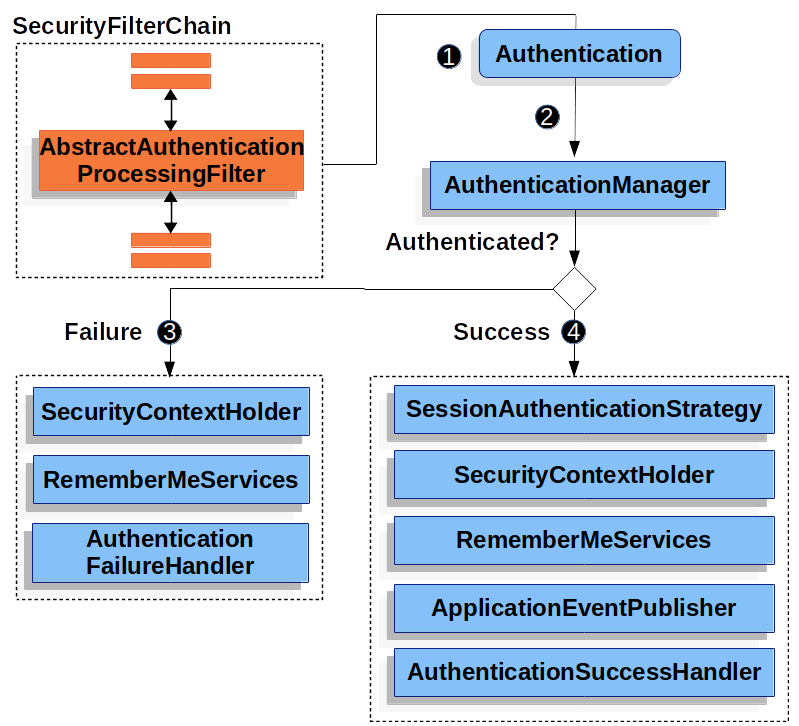 1) 사용자가 로그인을 했을때, AbstractAuthenticationProcessingFilter는 Authentication 객체를 생성하는데 이 Authentication는 해당 필터의 구현클래스에 따라 다르다. 예를들어 위 필터의 구현클래스 중 하나인 usernamePasswordAuthenticationFilter는 사용자가 제출한 id와 비밀번호를 가진 UsernamePasswordAuthenticationToken을 생성한다.