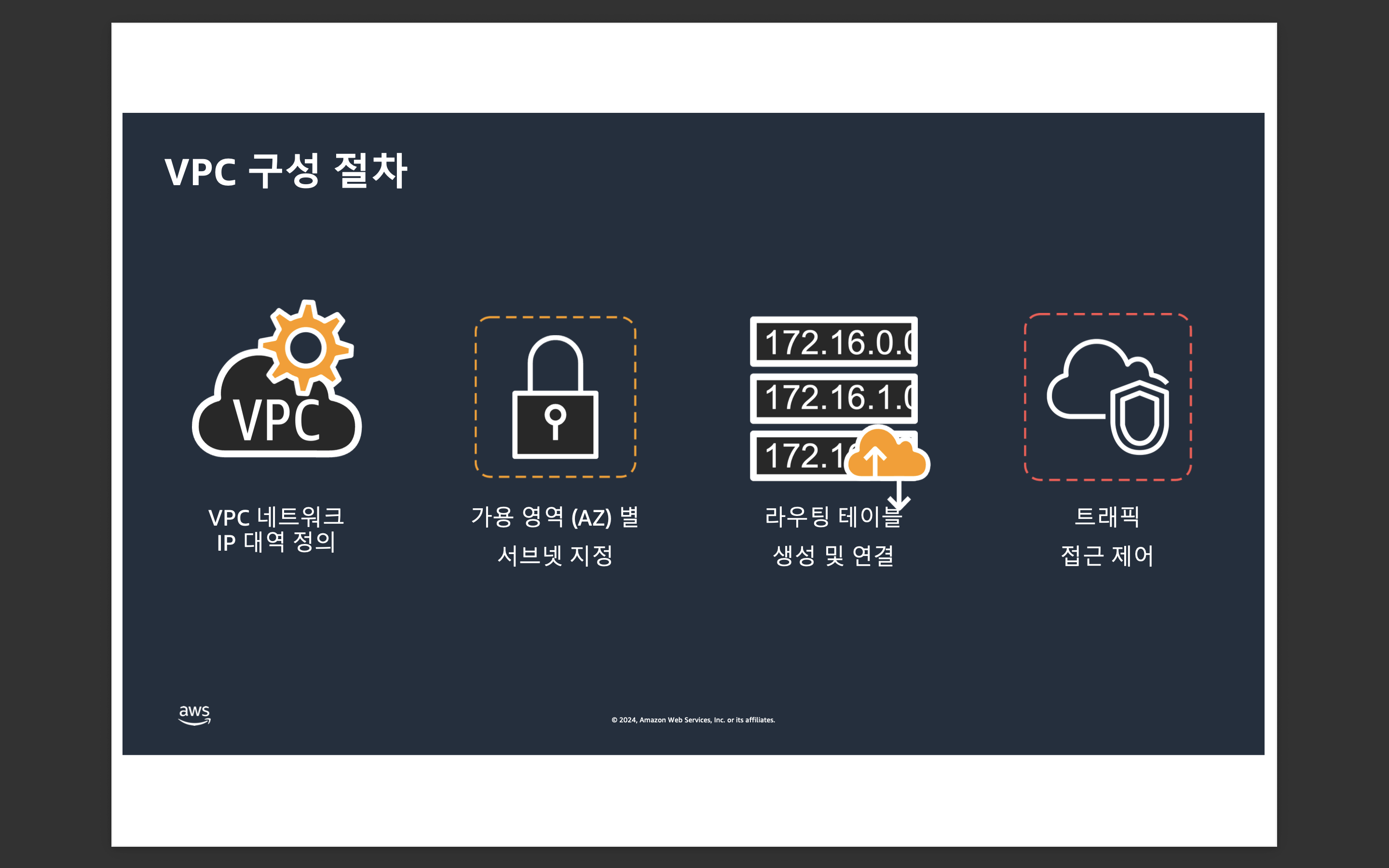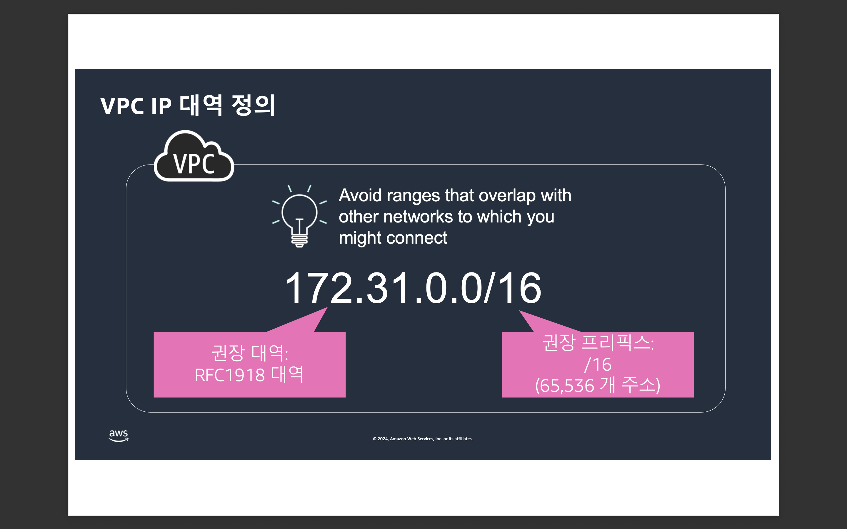 - 적절한 크기의 VPC 대역 확보 및 주소범위 중복 고려