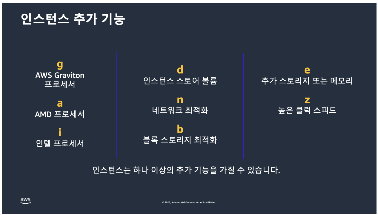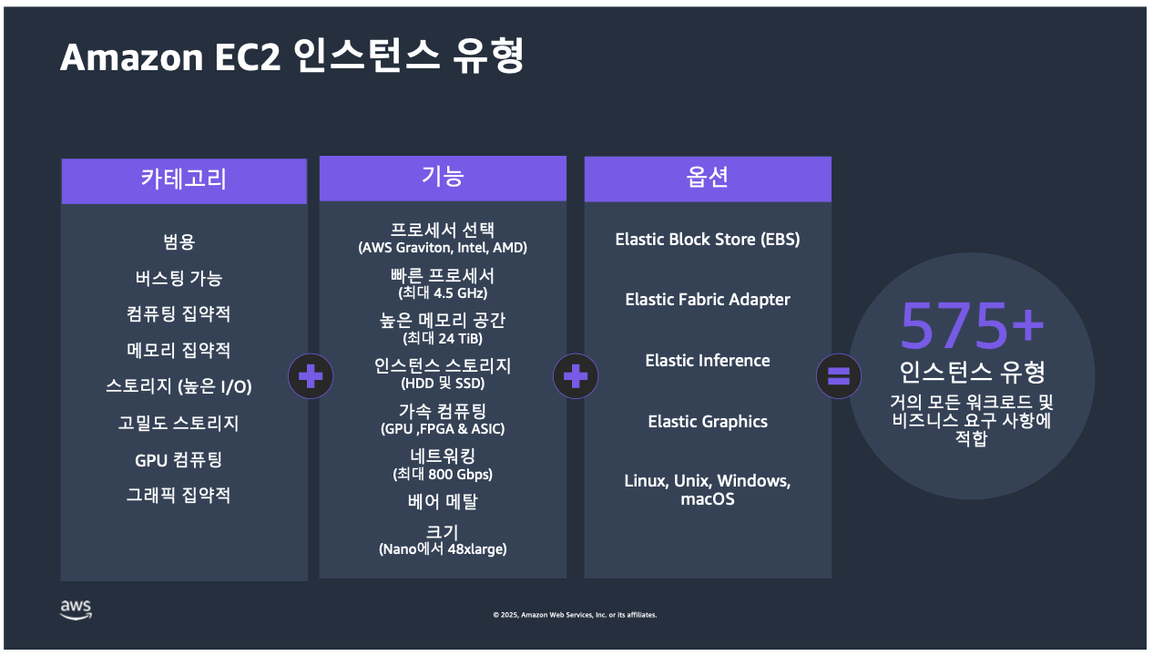 - 다양한 구매 옵션: 온디맨드 인스턴스, 스팟 인스턴스, 예약 인스턴스 (RI), 절감형 플랜 (Savings Plans), 전용 호스트