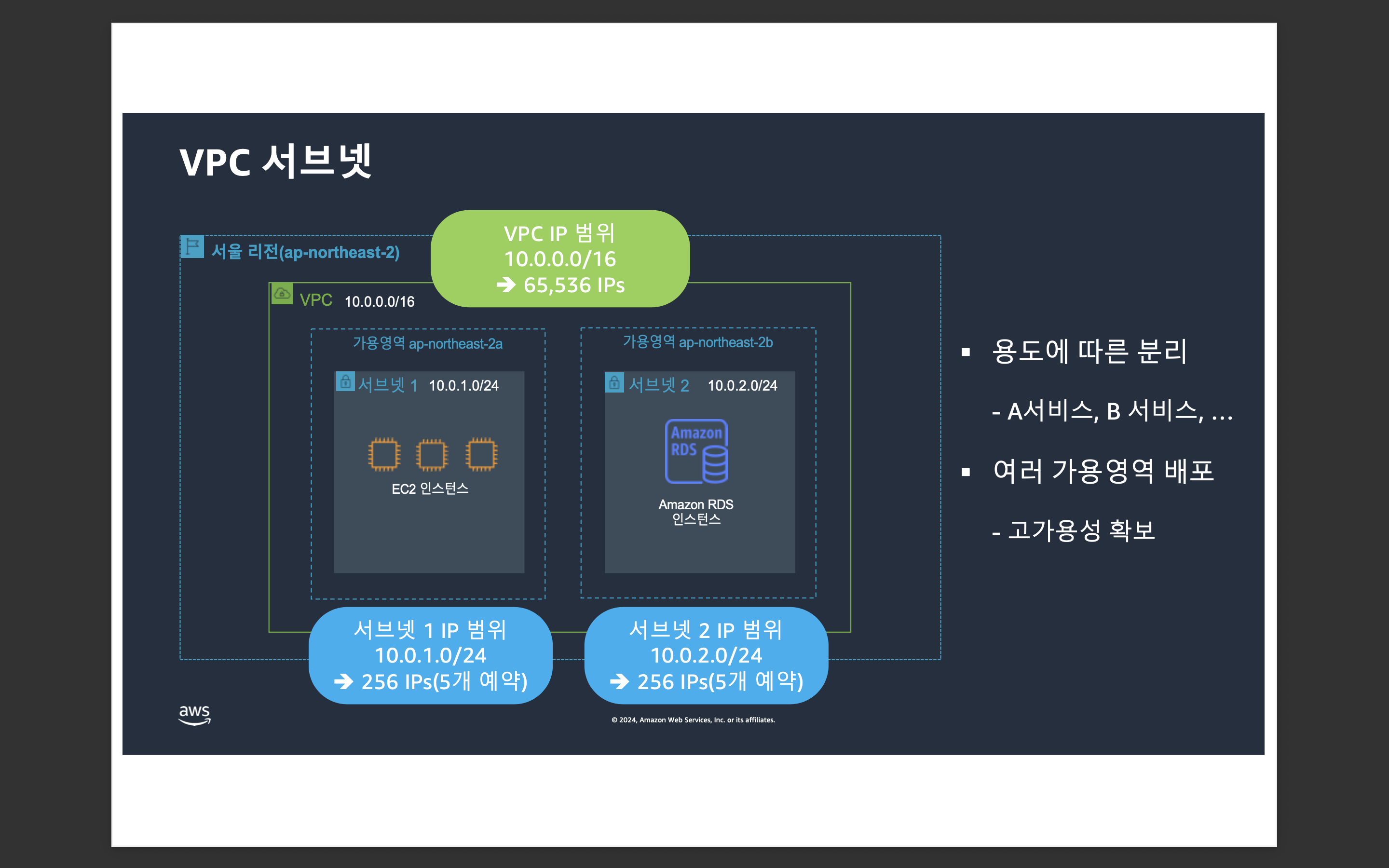- 여분의 IP 대역 확보 (가용영역 추가, 서브넷 분리 등)