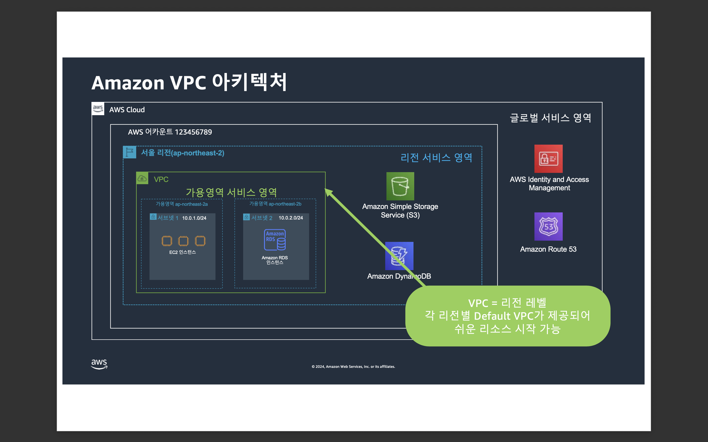 - 모든 리전 동일 대역을 쓰는 Default VPC 보다는 Custom VPC 활용(중복대역 방지)