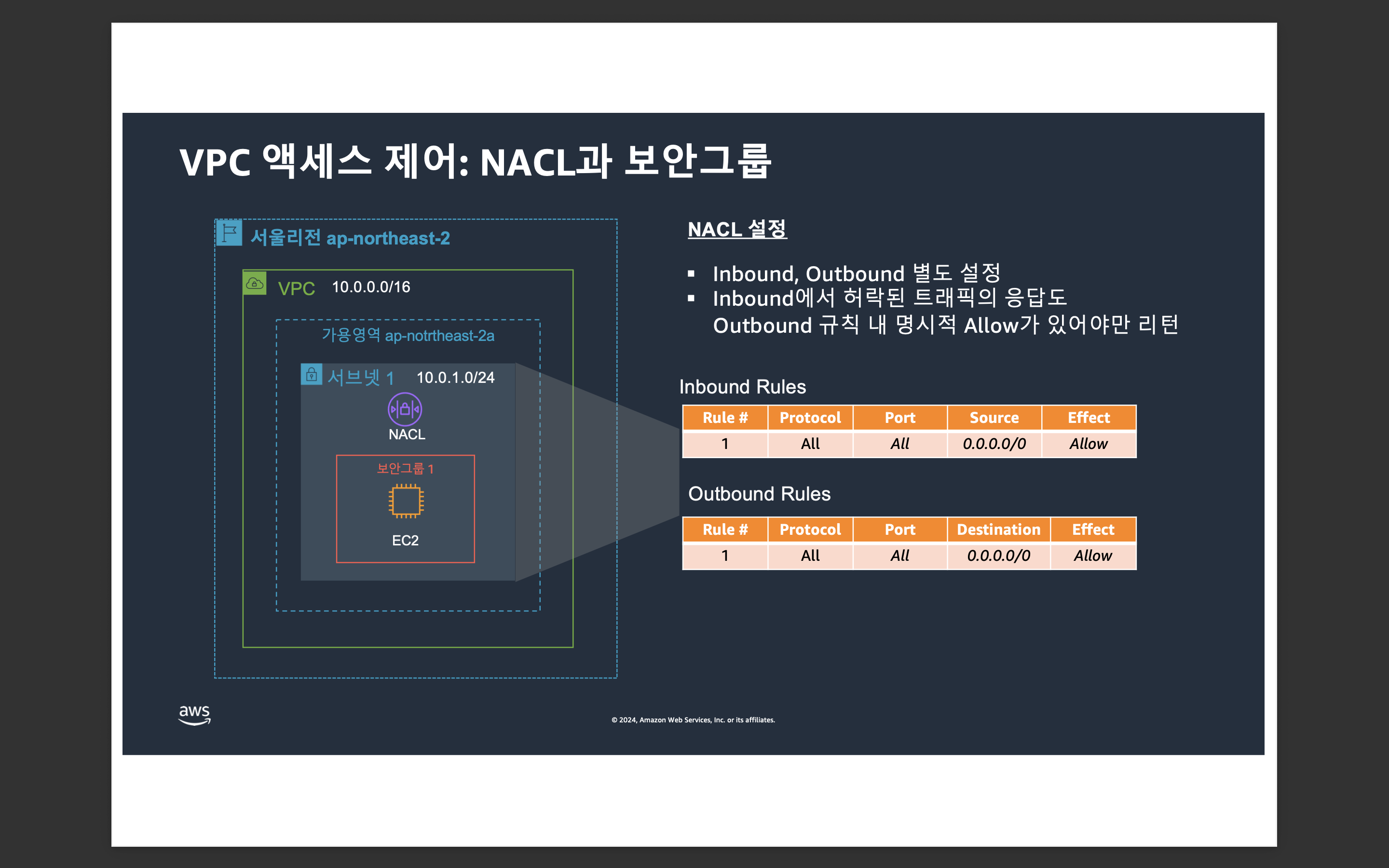 - NACL과 보안그룹으로 VPC 내 자원 액세스 제어