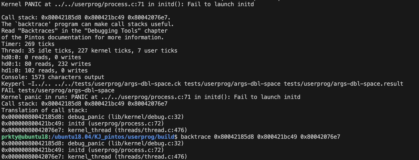 pintos 프로젝트에서는 디버깅을 위한 backtrace 기능을 제공한다. 보통 자동으로 보여주는데, 안될때가 있어서 [backtrace + Call stack들] 을 작성하여 실행하면 어디서 오류가 났는지 확인할 수 있다.
