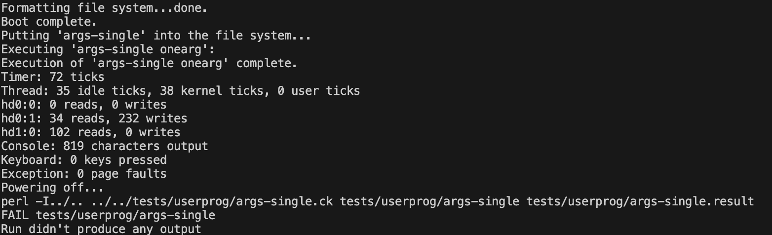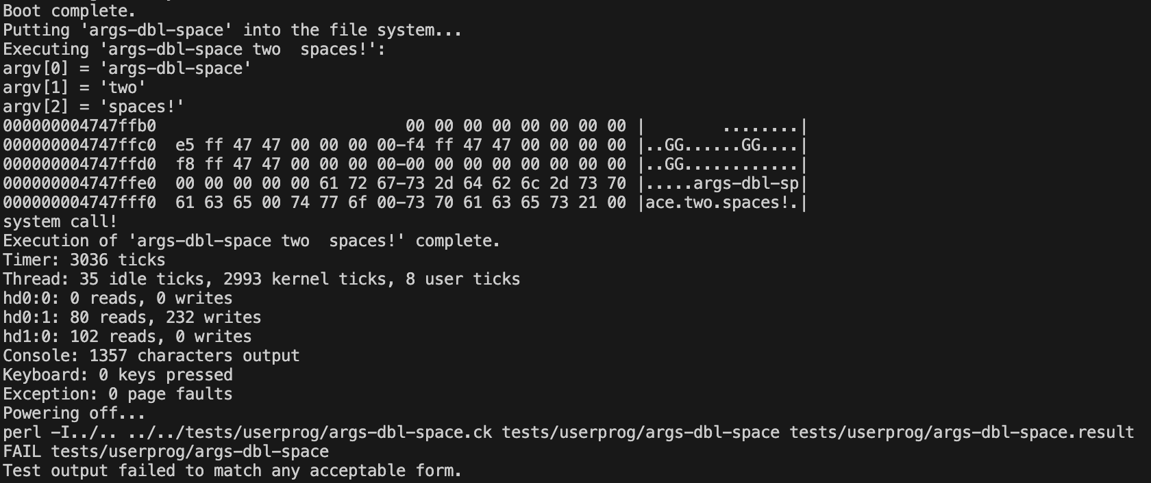→ 지금 테스트 케이스는 FAIL나오는게 정상입니다. 스택이 안짤리고 잘 나오는지 확인만하세요. 시스템콜까지 구현시 PASS됩니다.