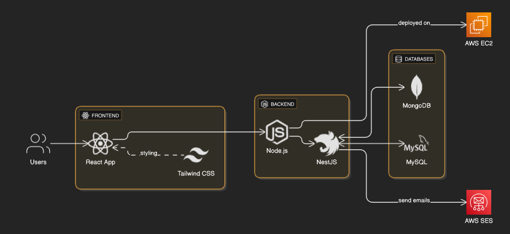 아키텍처는 다음과 같습니다. 현재 구상 중이며 프론트엔드는 재사용 가능한 컴포넌트로 유지보수가 유리한 리엑트를 사용하고, 벡엔드같은 경우는 이슈 생성 버튼을 누르면 DB에 저장되는 동안 화면이 즉시 응답해야하므로 비동기 처리가 유리한 Node.js와 복잡한 기능을 만들때 역할을 분명히 분리하여 쓰기 용이한 NestJS로 결정하게되었습니다.