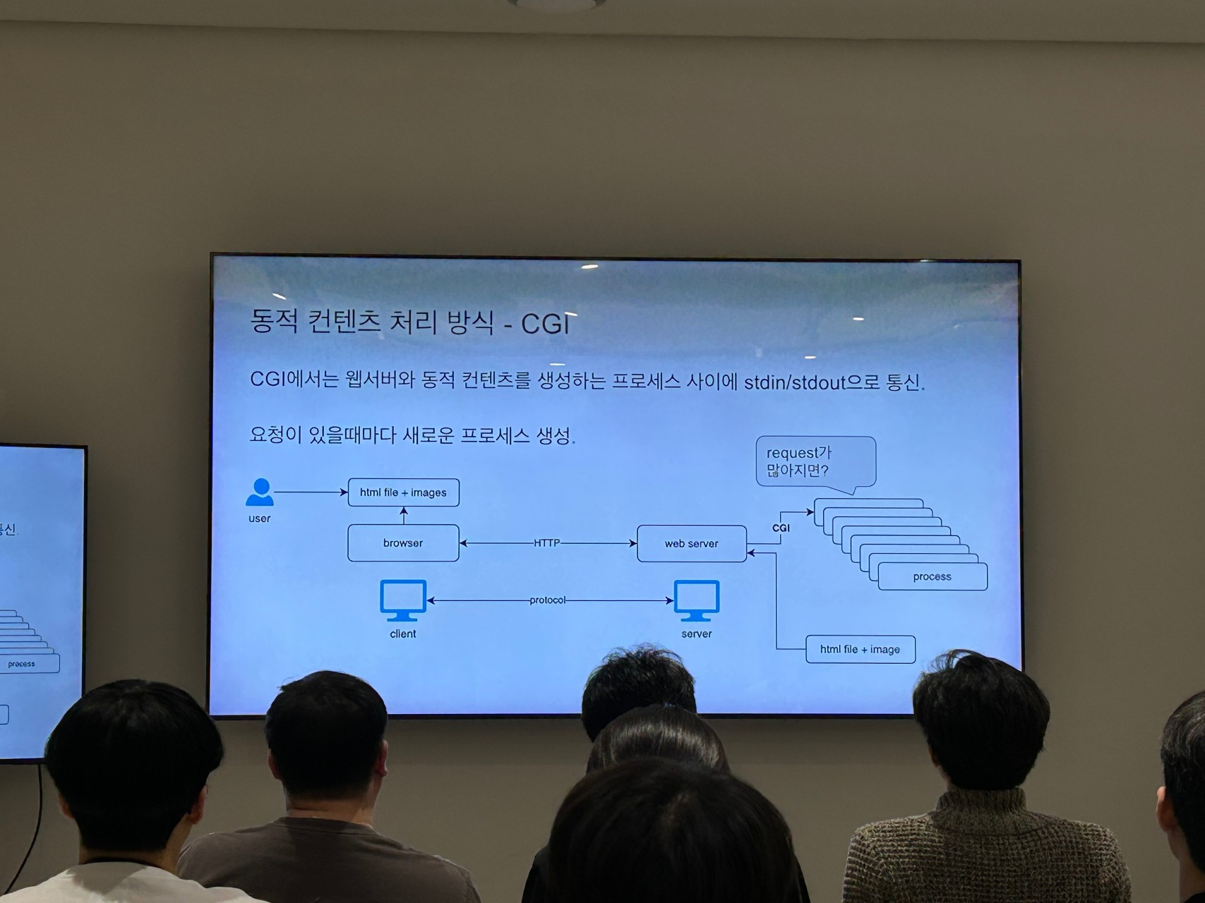 CGI는 웹서버와 동적 컨텐츠를 생성하는 프로세스 사이에 stdin/stout으로 통신.