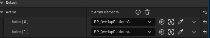 Active Variable Type을 BP_OverlapPlatform3로 하고 배열로 만들었음. 그래서 두개의 플랫폼을 한꺼번에 움직이게 할 수 있게 했고 다시 Overlap시 Toggle Platform으로 가게 해놨는데