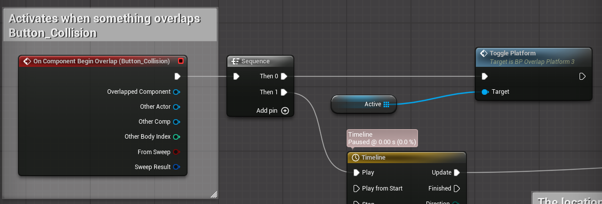 다시 여기로 돌아와서 TogglePlatform이 실행될때 IsRunning이라는 boolean타입의 변수가 계속 반대로 바뀌게 했음(토글화). True가 되면 Timeline 반복, False는 Stop으로 가게했음