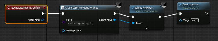 그리고 Overlap 될 시 Content browser에 WBP_Message 라는 Widget_blueprint를 만들어 CLEAR!!!를 만들고 Add to viewport로 화면에 띄웠다. 그리고 Destroy Actor로 먹으면 파괴되게 만들었음.